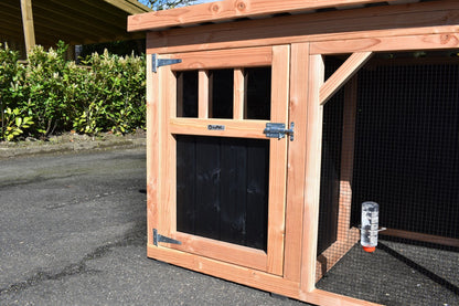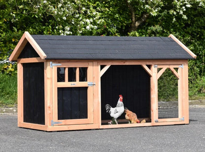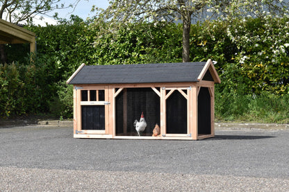 Dotato di una rete metallica sui lati e sul davanti , garantisce alle vostre galline libertà di movimento pur rimanendo perfettamente protette. Il tetto che ricopre il recinto le protegge da vento, pioggia e luce solare diretta, mentre l' ampio nido riparato, dotato di pavimento in legno Douglas, garantisce comfort e sicurezza per la notte e per la deposizione delle uova.